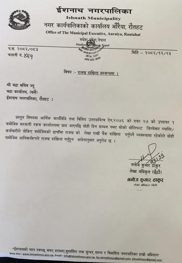 "ईशनाथको शान स्वच्छ, सफा, हराभरा, सुशाशित तथा सुन्दर, शान्त र विकशित नगरपालिका हाम्रो अभियान" मधेश प्रदेश, नेपाल सरकार